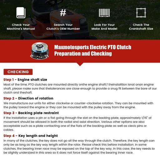- To find the perfect PTO clutch for your mower or lawn tractor, please double check OEM Part Number and Crankshaft before purchasing.