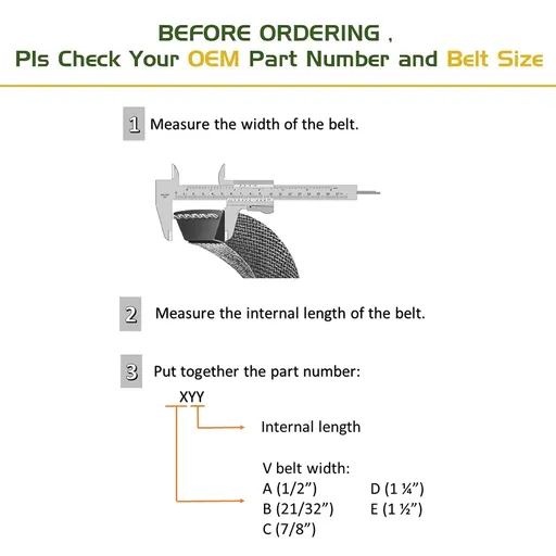 • Belt Size: Width:5/8"(Outside dimension),Length:138" (The number on belt is only the factory code, not the length of belt)