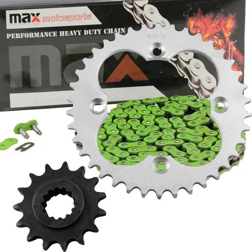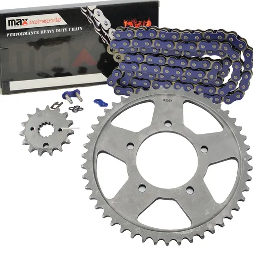 Hex Autoparts has a vast range of motorcycle chains & sprockets at great prices. Max Motosports chain and sprocket kit provide great strength and durability under all riding condition. Each chain and sprocket set includes original equipment front sprocket, rear sprocket and chain in a kit that provides convenience and total savings from purchasing each part separately.